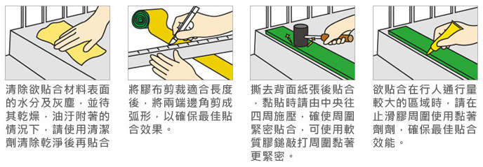 ※施工時表面溫度須高於10℃注1) 使用耐用型用(N-004)時,請在欲施工範圍使用接著劑,確保最佳貼合效能。注2) 使用於凹凸不平地磚、水泥地或者木材等施工面時,請使用接著劑,確保最佳貼合效能。